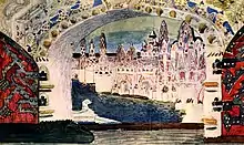Премьера музыкальной драмы, которая вдохновила Врубеля, состоялась в Частной опере С. И. Мамонтова 21 декабря 1900 года. Врубель создал эскизы для декораций и костюмов, а партию Царевны-Лебеди пела его жена Надежда Забела-Врубель.