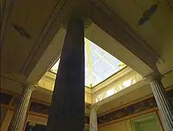 Такое устройство имеет и атриум в Царицыном павильоне. Середину его занимает квадратный бассейн из голубого и розового мрамора с фонтаном-вазой. По углам бассейна четыре колонны «голубого» мрамора поддерживают кровлю, но вместо открытого проёма А. И. Штакеншнейдеру пришлось предусмотреть стеклянный купол, который в холодную погоду закрывался, а в жаркую открывался. Прикреплённые в углах проёма фигурки фантастических чудовищ служили водостоками.