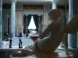 Стены экседры расписаны неяркими красками. В нишах установлены полукруглые синие диваны, повторяющие по форме изгиб стены, и круглые столики, созданные в России в первой половине XIX века. Французскими мастерами были выполнены стоящие в экседре светильники-торшеры, сделанные в подражание помпейской бронзе. Кроме торшеров комнату освещала масляная лампа-люстра, точно воспроизводящая лампу, найденную в Помпее. На отдельном постаменте стоит мраморная скульптура «Психея», выполненная в 1846 г. итальянским мастером Цинцинато Баруцци. На руке у Психеи бронзовая позолоченная бабочка.