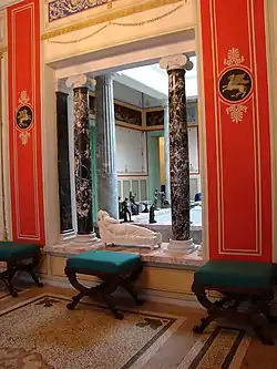 К атриуму помпейского дома со всех сторон прилегали различные помещения, получавшие из него свет и сообщавшиеся с ним не дверьми, а открытыми проходами и арками. В Царицыном павильоне справа от атриума находится комната с трёмя нишами (2), соответствующая античной экседре (комнате для отдыха).