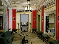 Две каннелированные колонны голубого мрамора разделяют гостиную на две неравные части. Кессонированный потолок расписан рамками из арабесок. Стены гостиной украшены ярко красными филёнками с небольшими медальонами тёмного цвета, в которых изображены грифоны — крылатые фантастические существа с телом льва и головой орла, древние символы власти. Мозаичный пол и камин чёрного мрамора выполнены мастерами Петергофской гранильной фабрики. На камине находится мраморный бюст римлянки (II—IV вв. н. э.) и две мраморные вазы.