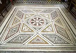 Главный вход в павильон расположен с юга, со стороны садика с фонтаном «Нарцисс» (ск. К. М. Климченко) и украшен небольшой лоджией с мраморными колоннами. Войдя в павильон, посетители попадают в атриум (1). У древних римлян это была главная часть дома — закрытый со всех сторон зал с проёмом в центре потолка, через который внутрь попадал дневной свет. Благодаря отсутствию окон, в жаркую погоду в доме было прохладно. А во время дождя воду собирали в бассейне-имплювии в центре атриума.