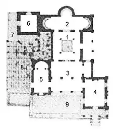 На плане павильона обозначены: 1. Атриум; 2. Экседра (комната с трёмя нишами); 3. Гостиная; 4. Столовая; 5. Кабинет императрицы; 6. Буфетная; 7. Наружная лестница на 2-й этаж (в кабинет императора); 8. Внутренний садик; 9. Терраса.