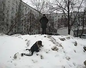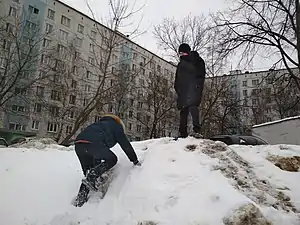 Один из числа играющих детей взбирается на невысокую снежную горку и оттуда кричит всем с вызовом: «Я — царь горы!» Остальные участники веселья со всех сторон самоотверженно бросаются на штурм этой горки.