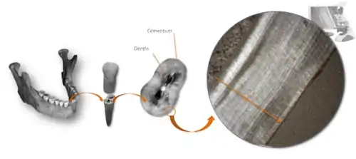 Цементохронология основана на предположении, что отложения дентина отражают годовой ритм и подсчет годовых колец на гистологических препаратах отражает возраст. Так, например, эти регистрирующие структуры хорошо изучены на примере зубов морских и наземных млекопитающих[7]. При рассмотрении под световым микроскопом определенный тип цемента (Acellular Extrinsic Fibers Cementum — AEFC), окружающий корень, выглядит как слои чередующихся темных и светлых полос.