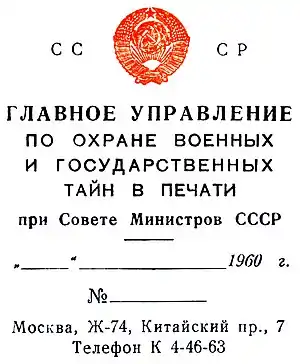 6 июня 1922 года декретом Совнаркома РСФСР было создано Главное управление по делам литературы и издательств при Наркомпросе с целью «объединения всех видов цензуры печатных произведений»[51]. Формально Главлит подчинялся Наркомпросу, а с 1946 года — Совету Министров СССР, но фактически цензура практически с первых дней контролировалась партийными органами[5]. Кандидатура руководителя Главлита утверждалась ЦК коммунистической партии по представлению руководителя отдела печати и издательств ЦК[30][52]. После образования СССР Главлит организовал местные структуры: республиканские Главлиты и сеть местных облгорлитов. Единственной республикой, не имевшей отдельного республиканского Главлита, была РСФСР — её курировал союзный Главлит.