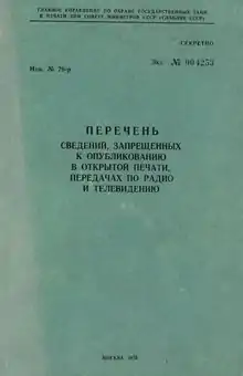 В 1925 году под грифом «Совершенно секретно» Главлит выпустил первый «Перечень сведений, составляющих тайну и не подлежащих распространению в целях охранения политико-экономических интересов СССР». Текст первого списка имел 16 страниц и содержал 96 пунктов[54]. Кроме перечня выпускались циркуляры с указанием запрещённых тем. Их число быстро росло. В документе, с которым работали цензоры в последние годы существования СССР, насчитывалось 213 параграфов, и в каждом — по 5, 6, а то и 12 пунктов[55].