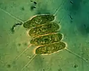![]() Ценобий водоросли Scenedesmus sp. |