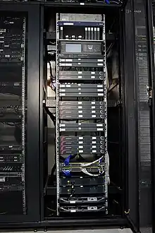 В серверной радиочастотные линии от антенного поста подключаются к делителям/сумматорам сигнала и через них на входы и выходы устройств, входящих в состав каналообразующего оборудования ЦЗС. К одному антенному посту может быть подключено несколько комплектов каналообразующего оборудования (хабов), в том числе разных типов, работающих в разных поляризациях или разных частотных интервалах одного диапазона на одном спутнике[31].