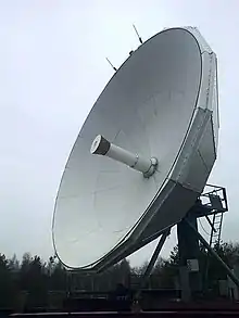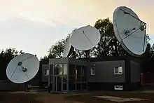 На антенне устанавливаются малошумящие приёмные усилители-конвертеры (LNB), рядом с антенной — передающие усилители (BUC), подключенные волноводами. Приёмные и передающие усилители обычно резервируются. Антенна оснащается также средствами наведения для постоянного удержания спутника в максимуме её диаграммы направленности и, при необходимости, системой антиобледенения[27]. Сигнал между антенным постом и серверной передается по коаксиальным кабелям или, в случае большого удаления, по волоконно-оптическим линиям[30].