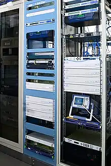 Каждая из этих функций может выполняться отдельным устройством в составе ЦЗС, либо несколько функций (например, инкапсулятор и модулятор, несколько демодуляторов обратных каналов) могут объединяться в одном блоке[31]. Существуют решения, реализующие все функции ЦЗС на единственном универсальном устройстве, с последующим расширением ёмкости и возможностей сети путем добавления однотипных блоков[33]. Для обеспечения бесперебойной работы компоненты ЦЗС резервируются. Для применений, требующих максимальной надёжности, может применяться географическое резервирование, с переключением между двумя удаленными друг от друга ЦЗС в случае, если работа одной из них становится невозможной из-за погодных или иных условий[36][37].
