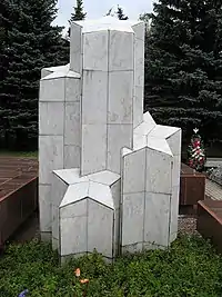Осенью 1978 года в городе при земляных работах были обнаружены останки двух солдат, которые были перезахоронены на Центральном кладбище возле входа. Учитывая тот факт, что в дальнейшем могут быть найдены другие останки защитников Москвы, администрация Зеленограда в этом же году объявила конкурс на проект памятника погибшим, победителем которого стал А. Г. Стискин. Памятник был открыт 8 мая 1981 года[9][13][17]. Мемориал представляет собой квадратный подиум из полированного красного гранита, в центре которого расположена четырёхметровая скульптурная композиция, облицованная белым мрамором — четыре пятиконечные звёзды, соединённые в одну фигуру. На горизонтальной плоскости плиты выполнена надпись из накладных металлических букв: «Павшим за Родину вечная слава». Перед памятником установлена мемориальная доска с надписью: «Братская могила воинов, погибших в боях на крюковско-истринском направлении осенью 1941 г. Памятник открыт 8 мая 1981 г.»[17][8][18][19][20].