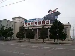 ![]() Здание музея. На западном фасаде транспарант «Революционный дух Пэкту» в виде горниста на фоне Пэктусана. | |