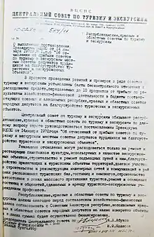 - ГАРФ. Ф. A259. (Совет Министров РСФСР (Совмин РСФСР). Оп. 48 (Управление Делами (переписка дела). Дела постоянного хранения 1979—1986 гг.). Д. 8020 (Дело о мерах по развитию туризма и совершенствованию туристско-экскурсионного обслуживания населения в РСФСР в 1986—1990 гг. и на период до 2000 г.). Л. 7.