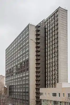 Здание института спроектировано коллективом мастерской №11 Моспроекта-2 в составе архитекторов Л. Н. Павлова, И. Я. Ядрова, Г. В. Колычевой, Г.Д. Дембовской и инженеров Е. Б. Гармсена, Л. А. Муромцева, В. А. Авербуха, Р. А. Рохваргера. Представляет собой композицию из двух наложенных друг на друга и поставленных на ребра квадратных пластин: по замыслу авторов в первой должны были расположиться кабинеты ученых, а во второй — компьютеры. Строительство института затянулось с 1966 до 1978 года, и вычислительная техника к тому моменту стала занимать значительно меньшие площади, поэтому первоначальная концепция оказалась излишне щедрой по отношению к ней.[1]