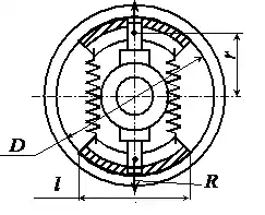 Ведущей частью в этих муфтах является ступица с колодками, которые перемещаются радиально. Ведомой частью является барабан, к ободу которого колодки прижимаются центробежными силами R. Кроме конструкций центробежных муфт с радиальными колодками, могут использоваться муфты с поворотными колодками.