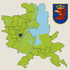 Γраничит с округами: Средместье-Пулноц (на севере), Средместье-Захуд (на юго-востоке), Старе-Място (на востоке) и Нове-Място (на юге)[1].