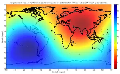 Важно использовать культурно-нейтральный метод при расчёте показателей для целого мира. Как предписывает Национальный институт изучения демографии (Франция),[1] методология допускает использование только глобуса, и некорректно проводить расчёт по двумерной проекции поверхности Земли (карте). Центр населённости Земли был найден «на перекрёстке между Китаем, Индией, Пакистаном и Таджикистаном», по существу расположен в Афганистане.[1] Абсолютная погрешность расчёта составляет несколько сотен километров, более точное местоположение неизвестно. </ref>