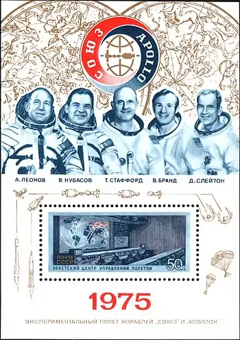 - 1973—1976: Создание на базе КВЦ Советского центра управления полётом с новым комплексом технических средств для обеспечения реализации совместного с США экспериментального проекта «Союз» — «Аполлон». Специалистами советского и американского ЦУПов проводится большая работа по согласованию терминологии, моделей движения КА, технической документации, организации взаимодействия двух ЦУПов. Обеспечивается управление модернизированными кораблями «Союз» в беспилотном и пилотируемом вариантах. БЦ ЦУПа становится головным по пилотируемым программам. ЦУП в Евпатории становится Запасным ЦУП[2]. В ЦУПе создаётся подразделение командно-программного обеспечения управления полётом. Совместный полёт пилотируемых кораблей «Союз-19» (СССР) и «Аполлон» (США) с их стыковкой на орбите и взаимными переходами членов экипажей из корабля в корабль состоялся в июле 1975 года.