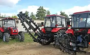 Цепные траншейные экскаваторы могут дополнительно оборудоваться бульдозерным отвалом, что позволяет выполнять планирование участка перед отрывкой траншеи, засыпа́ть траншею после укладки в неё кабелей и осуществлять другие работы. Так, бульдозерным отвалом оснащаются экскаваторы типа ЭТЦ-165 и им подобные. Возможно агрегирование траншейного экскаватора и с другим оборудованием: погрузочным ковшом, дорожной фрезой и др. Баровый рабочий орган может выполняться сдвоенным или строенным, что позволяет нарезать в параллельные щели в мёрзлом грунте для дальнейшей его разработки[11].