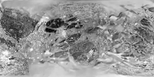 Эта цепочка из 13 кратеров сформирована, вероятно, столкновением с кометой, которая была разорвана на части гравитацией Юпитера. Вскоре после разрушения кометы 13 её фрагментов упали подряд на Ганимед. Кратеры Энки легли поперёк чёткой границы между светлой и тёмной областями, разделёнными тонким жёлобом (на снимке проходит через центр, по диагонали). Выброшенное вещество, окружающее кратеры, на светлой области оказалось очень ярким. Но хотя все эти кратеры сформировались почти одновременно, в тёмной области различить выброшенное вещество сложно. Возможно, причина этого в том, что столкновение извлекло и перемешало тёмный материал, который оказался неразличим на тёмной поверхности[2].