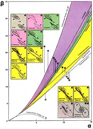 В случае, когда параметры α и β принадлежат области, обозначенной на диаграмме цифрой 1, в системе существуют два устойчивых положения равновесия d и −d и одно неустойчивое, находящееся в начале координат 0. В этом случае цепь Чуа в зависимости от начальных условий будет стремиться к одному из двух устойчивых положений равновесия. В случае, когда параметры системы находятся в области помеченной цифрой 2, в окрестности точки равновесия d или −d существует устойчивый предельный цикл. По мере приближения к границе с хаотическим режимом система претерпевает цикл удвоений периода вплоть до образования хаотического аттрактора Рёсслера. Приращение значений параметра перед наступлением каждой последующей бифуркации удвоения периода уменьшается согласно соотношению Фейгенбаума. При попадании параметров в область, помеченную цифрой 6, образуется странный аттрактор (рисунок 4), называемый «двойной завиток» (англ. double scroll). При этом типе поведения траектория система проходит в окрестности и верхнего, и нижнего положения равновесия. Внутри области существования аттрактора «двойной завиток» также существуют окна периодичности, подобные тем, которые существовали в области аттрактора Рёсслера. Отличием их является то, что периодическая орбита в этом случае охватывает оба положения равновесия. Когда параметры α и β переходят в область, помеченную на рисунке 3 цифрой 11, в колебательной системе наблюдаются колебания неограниченно нарастающей амплитуды вне зависимости от начальных условий. Поскольку диод Чуа реализуется на операционных усилителях, он имеет ограниченный динамический диапазон, и поэтому в системе существует также большой по размерам устойчивый предельный цикл, охватывающий все сегменты характеристики диода Чуа.