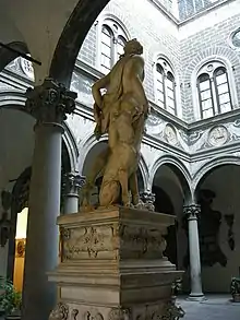 Скульптурные изображения «адова пса» Цербера известны ещё с античных времён. В ряде случаев они имели не только декоративное, но и культовое значение. Так, по преданию золотая статуя Цербера работы бога кузнечного мастерства Гефеста охраняла святилище Зевса в городе Прас восточного Крита[46]. О скульптурных изображениях Геракла с Цербером упоминает Павсаний при описании убранства Олимпии[47], трона в Амиклах[48], гераклейона в Фивах[49] и др.[7].