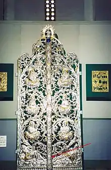 Другим подарком стали серебряные с позолотой царские врата весом 50 кг, которые по заказу гетмана Мазепы были отлиты в Германии (Аугсбург) по эскизу неизвестного черниговского художника. По некоторым данным, металл для ворот — серебряный идол, найденный на территории черниговского Вала[18]. По описанию Сергея Колесника, «в центральной части каждой створки находятся изображения святых Бориса и Глеба, выше и ниже — образы четырёх евангелистов. В самом низу изображены пророк Исайя и царь Давид, в верхней части — Богоматерь и архангел Гавриил, на самой верхушке — благословляющий Христос, а по центральной оси сверху донизу расположены изображения десяти царей Иудеи. Самую нижнюю же часть врат украшает герб гетмана Ивана Мазепы. Царские врата являются шедевром искусства, который дошёл до нас почти неповрежденным»[19].