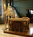 - Алавастр со святым Миром (ми́рница), иногда вместе с крестильным ящиком — ставится рядом с дарохранительницей.