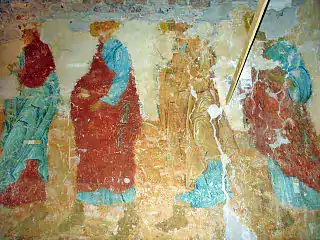 На стенах западного объёма, в верхнем регистре фрагментарно сохранилась грандиозная композиция «Вознесение Христа». На южной и северной стенах — 12 апостолов в рост, в трёхчетвертном повороте, обращённые к Богоматери. Образ её написан на западной стене. За спиной Богоматери — два ангела в белых одеждах. Уцелели только нижние части фигур Богоматери и ангелов. Из 12 апостолов только у одного сохранилось личное письмо. Остальные лики были утрачены при устройстве позднего свода. Погибло и изображение Христа в сиянии с ангелами и серафимами, которое находилось на утраченном своде.