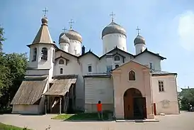 Первая каменная церковь на этом месте была выстроена в 1383—1384 годы посадниками Родиславом Даниловичем, Устином и Филиппом[1].