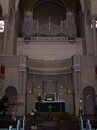 Внутреннее пространство церкви сверху замыкает восьмиугольный купол. Над главным залом поднимаются хоры, их балюстрады украшены рельефами[7][8].