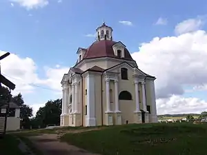 Здание церкви находится на невысоком холме, недалеко от парка и озера. Храм каменный, в стиле барокко, выполнен в форме восьмерик на четверике, увенчан гранёным куполом. Архитектура храма нетипична для архитектуры белорусского барокко[12]. Наблюдаются архитектурные параллели с вильнюсским костёлом Сердца Иисуса[12].