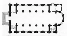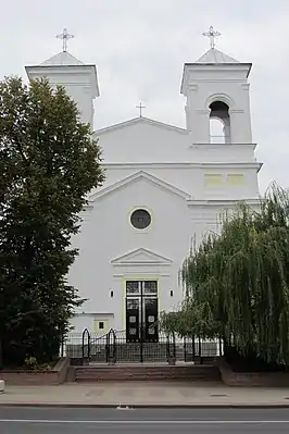 Воздвиженский храм — прямоугольное в плане здание, интерьер поделён восемью колоннами на три нефа[1]. Полукруглая апсида завершает центральный неф, сбоку от алтарного пространства находится единственная ризница. Главный фасад расчленён по вертикали на три части пилястрами[1]. Сверху фасад завершён аттиковой стенкой с треугольным контуром между двух прямоугольных в плане башен с арочными проёмами. Башни были восстановлены в 90-х годах XX века в ходе реконструкции костёла.