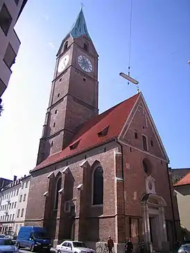 В 1478 году кладбище прихода Святого Петра было перенесено в район Хакенфиртель («in dem Haggen»). Местный архитектор Йорг фон Хальсбах (Jörg von Halspach, ум. 1488), известный также как Гангхофер, спроектировал новую кладбищенскую церковь и руководил её строительством. Здание храма было обращено на юг, что было необычным решением до XIX века: поскольку любая ориентация, кроме восточной, не одобрялась Римской курией — особенно для кладбищенских церквей — в связи с тем, что возвращение Иисуса Христа ожидалось именно с востока. Хальсбах спроектировал простое кирпичное здание со шпилем и четырьмя крытыми фронтонами. В 1485 году храм был освящен как церковь Всех Святых «ам Кройц» (am Kreuz); в период после 1493 года церковь было дополнена башней-колокольней — башня была увеличена в высоту после 1506 года.