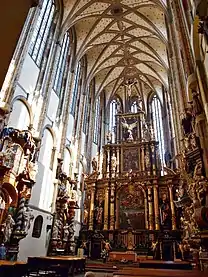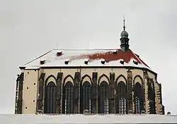 Внутреннее пространство хора в настоящее время, по сравнению с первоначальным состоянием, гораздо ниже. Первоначальные готические крестовые ребристые своды, которые достигали высоты 34 метров, в конце XVI века были полностью разрушены. После того, как Рудольф II передал монастырь францисканцам, которые начали реставрацию, пространство было снова перекрыто сниженными сетчатыми ренессансными сводами. Естественно, вместе с этим снизились и окна. Следы первоначальных готических сводов можем наблюдать на чердаке церкви. Арки окон видны и снаружи.