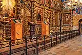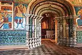 Внутреннее убранство храма дополняют золочёный резной иконостас с коллекцией древнейших икон, расписные порталы и изразцовый фриз, богатая церковная утварь.