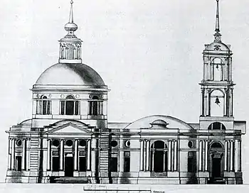 В плане храм симметричен относительно центральной оси. Основной объём здания имеет форму ротонды с полукружием апсиды. Первоначально ротонда была построена в трёх светах и была завершена высоким куполом с цилиндрическим световым фонарём и маленькой главкой с длинным шпилем. В световом фонаре имелись четыре окна, ориентированных по сторонам света. К основному объёму пристроены два боковых придела — северный и южный, прямоугольные в плане и завершённые с востока и запада полукружиями. Приделы декорированы четырёхколонными входными портиками тосканского ордера. Апсида и приделы имели трёхступенчатую кровлю. Обширная трёхнефная трапезная вытянута поперёк оси храма и соединена с ним коротким переходом. Трапезная была увенчана маленькой декоративной главкой и имеет пологую купольную кровлю[3].