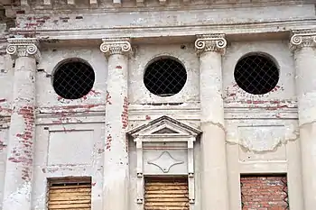 - каждый портик трапезной зодчий планировал украсить красивым большим арочным окном, декорированным балюстрадой и двумя тонкими колонками внутри, и разместить его между двумя парами сильно раздвинутых полуколонн, а в построенной церкви вместо него три обычных, прямоугольных проёма с круглыми окнами над ними.