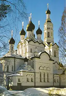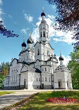 Многоглавая церковь с высокой колокольней (49 м вместе с крестом) в московско-ярославском стиле XVI века, с тем различием, что устранена пестрота окраски, и вся церковь снаружи оштукатурена и окрашена в один белый цвет. По проекту предполагалось расписать храм изнутри, но началась Первая мировая война, и эти планы не были осуществлены. Вместимость храма по расчёту архитектора — 800 человек, в действительности вмещает до 1500 человек.