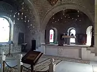 Церковь имеет крестообразную форму и отличается уникальной внутренней отделкой. На входе, увенчанном куполом, высечена надпись: