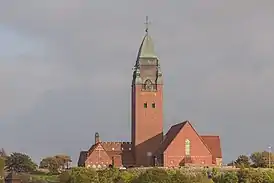 Здание церкви красного кирпича на фундаменте из серого природного камня построено в стиле национального романтизма. Кладка сделана из кирпича необычно большого размера — 10х15х30 сантиметров. Объём церкви трёхнефный, с трансептом; главный вход расположен на северной боковой стене нефа. Квадратная в плане башня высотой 60 метров, увенчана шаром и крестом с флюгером в форме петуха. Кровля церкви черепичная, на бетонных перекрытиях, потолок деревянный; башня же покрыта медными листами.