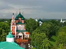 Вид со звонницы монастыря на древние храмы вдоль берега Которосли
