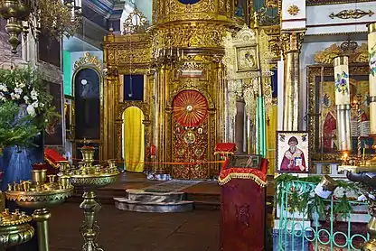 Главный иконостас создан ко времени освящения храма в начале 1797 года. Деревянный позолоченный иконостас, выполнен в барочном стиле и украшен резьбой, имеет необычную и сложную конструкцию. Его средняя — главная — часть почти круглой формой сильно выступает на очень просторную солею. Главные иконы — ростовые изображения Господа Вседержителя и Богородицы Великой Панагии — находятся по бокам этой округлости иконостаса, и увидеть их одновременно возможно только в ракурсе и только частично, так как деревянные щиты икон, повторяя форму конструкции, искусственно закруглены[17].
