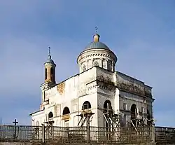 «церковь кирпичная, внутри и снаружи оштукатуренная, покрытая железом, покрашена зелёной краской. Храм включает в себя: главное помещение, трапезную, притвор с колокольнею. Главы и кресты позолочены червонным золотом, вокруг церкви — кирпичная ограда, покрытая железом. Церковь увенчана барабаном с куполом и с ветровым фонарем, колокольня с купольным покрытием. Большой церковный колокол „Благовест“ весил 100 с лишним пудов»