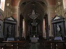 Интерьер богато украшен, в убранстве использованы пластичные архитектурные формы барокко, скульптура, живопись. Над входом на деревянных крестообразных столбах расположены хоры со старинным органом. Четырёхколонный главный алтарь украшен скульптурами, лепным орнаментом и гербом Сапег. По сторонам колонн расположены деревянные скульптуры апостолов Петра и Павла.