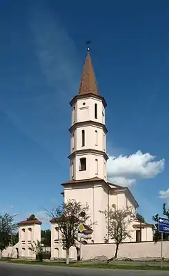 В архитектуре храма доминирует высокая четырёхъярусная башня, возглавляющая композицию памятника. Входной портал находится в нижнем ярусе башни, выполненным в виде четверика, прочие три яруса башни — восьмигранные, уменьшаются в размерах с высотой. Завершается башня высоким шатром. Главный фасад костёла оформлен пилястрами, а боковые — контрфорсами.