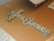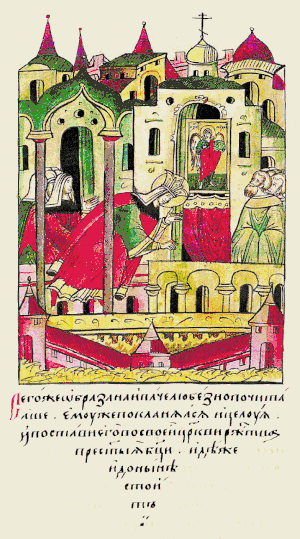 ![]() Княгиня Евдокия устанавливает в только что построенном храме икону ангела, написанную по её описанию после явления ей ангела | |