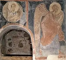 Между ними в своде алтарной апсиды располагается изображение Богоматерь с двумя предстоящими Ей архангелами — второй по значению после Христа образ в росписи храма. Богородица изображена в типе Оранты с Младенцем Христом на лоне. Ещё одна небольшая композиция располагалась в северной части алтаря в жертвеннике. Здесь было представлено поклонение Жертве. Сохранились фигуры святителей Василия Великого и Иоанна Златоуста и ангел-диакон с рипидой.