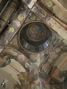 В куполе храма изображён Христос Вседержитель, окружённый небесными силами. Эта традиционная, венчающая пространство храма композиция имеет характерные и для других новгородских церквей особенности. Правая благословляющая рука Господа полусжата так же, как на утраченной фреске купола Софийского собора. Небесные силы — четыре архангела, два херувима и два серафима напоминают их изображения в других ансамблях XIV века: Спасе на Ильине, Феодоре Стратилате на ручью и др. Ниже между окон барабана попарно изображены восемь пророков: Аввакум и Даниил, Иезекииль и Иоанн Предтеча, Исаия, Илья и два неизвестных. Частично сохранились надписи на развёрнутых свитках в руках пророков. Ещё восемь пророков — Моисей и Аарон, Исаия и Иона, Иеремия и Софония, Малахия и ещё одна утраченная фигура — представлены на подпружных арках, несущих купол, а на арке отделяющей конху алтарной апсиды изображены первосвященники Мелхиседек и Захария. Здесь же в алтаре на боковых гранях восточных столбов напротив друг друга изображены цари Давид и Соломон. Столь многочисленные ветхозаветные персонажи дополнены традиционными фигурами пишущих евангелистов, изображённых в парусах храма. Над восточной подпружной аркой между фигурами евангелистов помещён Спас Нерукотворный — образ Христа на убрусе. На соответствующих местах над боковыми арками изображены обращённые к образу Спасителя ангелы, а напротив убруса над западной аркой другой образ Христа — Эммануил. В зените каждой из арок над головами пророков помещены крупные медальоны с торжественными изображениями крестов-никитрионов.